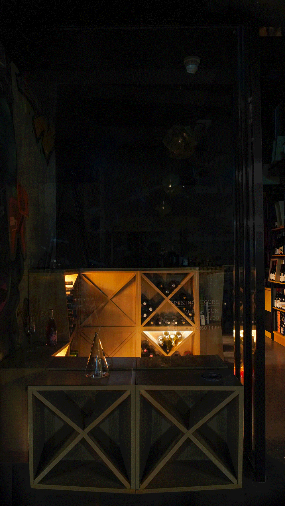 The design features an array of modular wine cubes, which are used for logistics, that serves as the bar counter, storage and seating area. The aforementioned modules and functions are connected into one piece of installation with cubical undulation, running from the interior to the exterior. The ceiling of the bar counter area is lowered with the material and feature of ship decking, in order to create coziness via an adjustment of human scale.